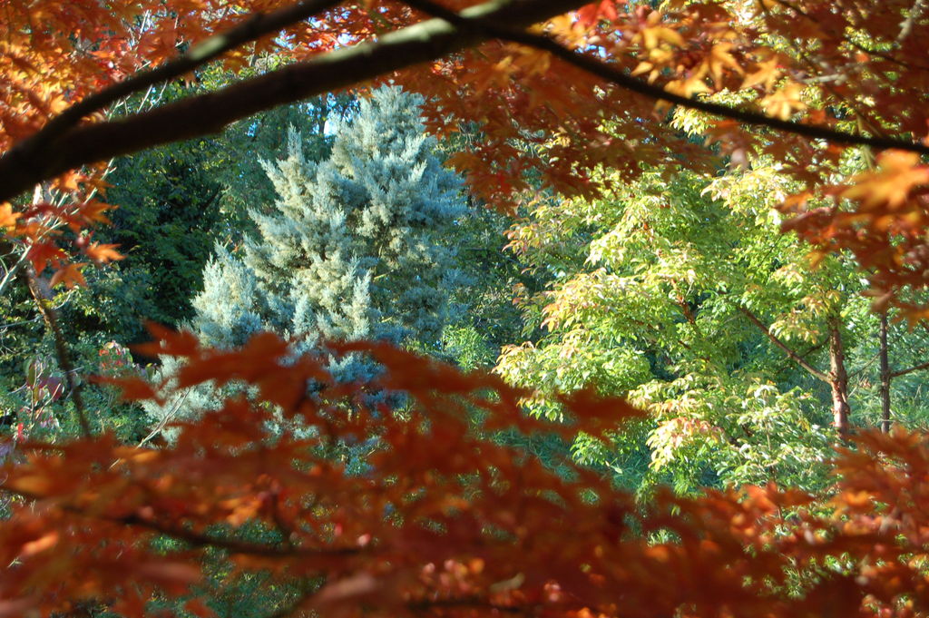 Leider war nicht ALLES scharf zu bekommen:Trotzdem, der Blick durch den immer rötlicher werdenden Ahorn auf den Zimtahorn und die graublaue Arizona-Zypresse (/*Cupressus arizonica Glauca*/) ist schon beeindruckend AM#