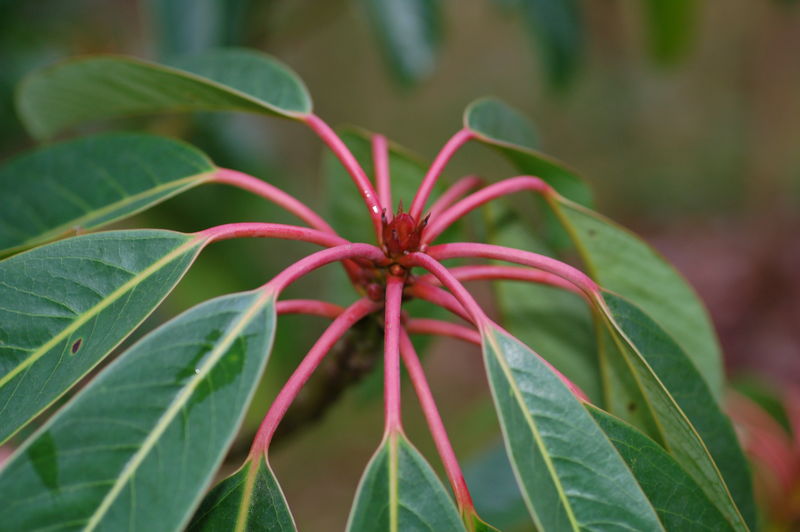 Mit zunehmender Jahreszeit verfärben sich die Blattstiele von /*Daphniphyllum macropodum*/ leuchtend rot! Ein absolut exotischer Anblick!