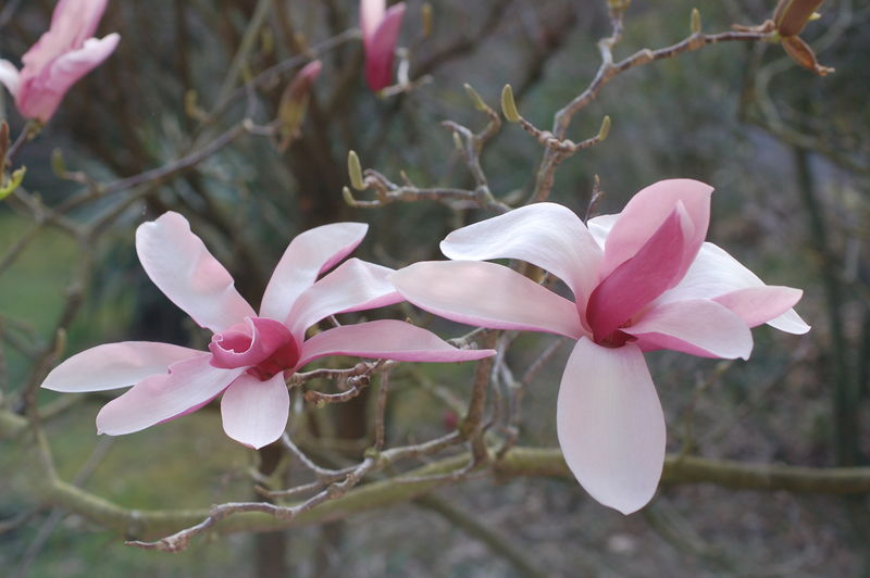 Aus einer Kreuzung aus Magnolia X veitchii 'Rubra' (= Selektion aus der Kreuzung aus M.campbellii mit M. denudata) mit M.liliiflora 'Nigra' züchtete Todd Gresham (Californien) Mitte/Ende der 50iger die sogn. 'Svelte Brunettes' (Schlanken Brünetten).Einer der schönsten ist sicherlich /*Magnolia 'Royal Crown*/, die bei mir mittlerweile Baumcharakter angenommen hat.Die Blüten haben einen Durchmesser von ca 30cm- sind also mehr als doppelt so groß wie die Soulangiana-Blüten- und nehmen die typ. "Tassen/Untertassengestalt" ihrer genetischen Großmutter (M.campbellii)an.
