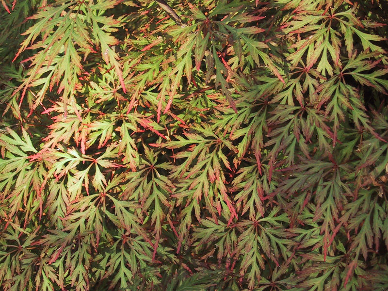 /*Acer palmatum Orangeola*/ wächst in Trauerform drehförmig aufsteigend und zeigt rötl. Blattspitzen (=keine Herbstfärbung)