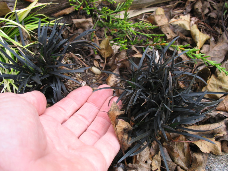 da wir gerade beim Größenvergleich sind: die Kleinausgabe des schwarzen Schlangenbartes Ophiopogon planiscapus 'Black Lissy' hat sich zwar langsam aber gut entwickelt und bleibt vor allem stabil und klein
