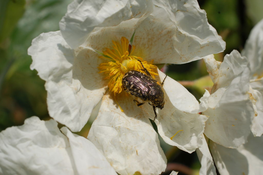 Exoten gehören nicht ins Land!!!, da die einheimischen Insekten keine Nahrung finden, trifft auf die meisten "Exoten" nicht zu!!/*Cistus laurifolus*/ scheint zum "Rudelgucken" für Käfer ideal geeignet zu sein: Innerhalb weniger Minuten konnte ich mindestens 8 oder 9 Arten erkennen, leider aber nicht benennen (Vielleicht findet sich einer im Forum?![]()