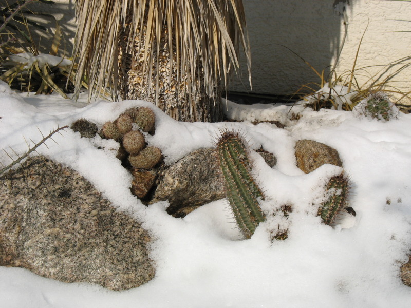 was hier zum Vorschein kommt. Allerdings nicht alle, denn die Gruppen von Echinocereus und Escobaria werden mit zunehmender Größe empfindlicher gegenüber Fäulnis, da sie - ungeschützt - kaum noch richtig im Innern abtrocknen. Die Puyas, links und rechts iim Hintergrund, hats ausnahmslos erwischt