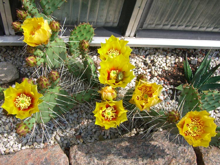 Opuntia phaecantha var. longispina, steht zumindest auf dem schild, warscheinlich auch eine der vielen hybriden, erworben vor 3 jahren bei kakteenhaage und seitdem im freiland, blüht nun das erste mal