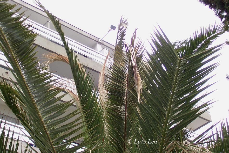 Zwei leicht Blatt geschädigte 'Phoenix c.' im Garten des Hotels "Parc Du Lac".