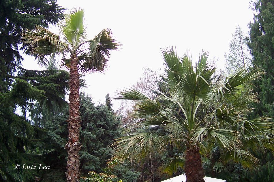 Auch diese beiden 'Washingtonia filifera'(???) Palmen im Garten des "Parc Du Lac" Hotels mit leichten Winterfolge-Blattschäden!