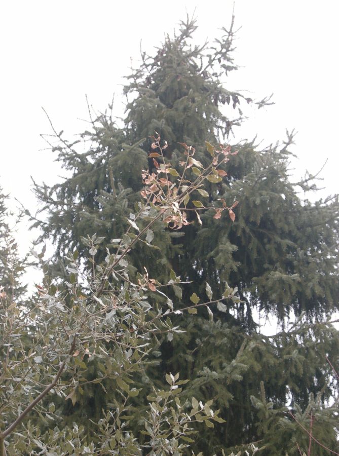 Steineiche - braune Blattspitzen. Vollbild siehe Schneebilder