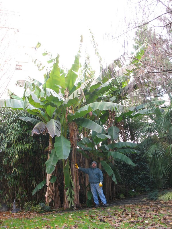 Die Pflanze präsentierte sich heute in relativen guten Zustand, wenn auch oben etwas zerfleddert - Stadtklima?! Mit Hilfe unseres ausgefahrenen Hochentasters haben wir eine Gesamthöhe von ca. 7,50 m ermittelt. Die Musas in meinem Garten - exakt 13 Autokilometer entfernt - sehen nach einigen leichten Frösten schon sehr mitgenommen aus.