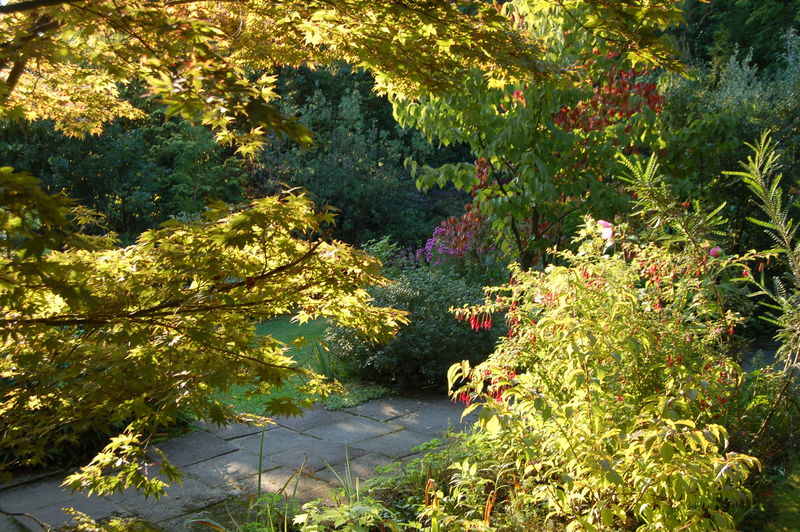 ....manchmal langt auch nur 1, um die wunderschöne Altweibersommer-Stimmung von heute einzufangen, hier v.a. interessant: li Sophora microphylla Sun King,Fuchsia magellanica gracilis,mittig: Davidia, hi re Rhamnus alaternus Argenteovariegatus, eingerahmt von Acer palmatum Atropurpureum!