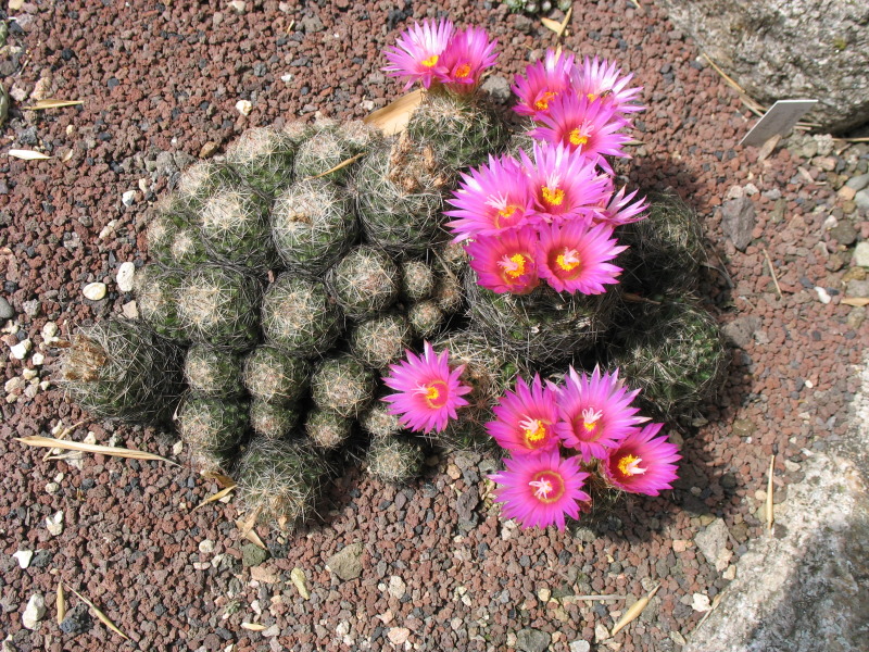 Escobaria vivipara in Blüte. Der linke Teil der Gruppe blühte bereits vor vielen Wochen mit kleinen kleinblimg hellrosa. Wohl ein Hybride?