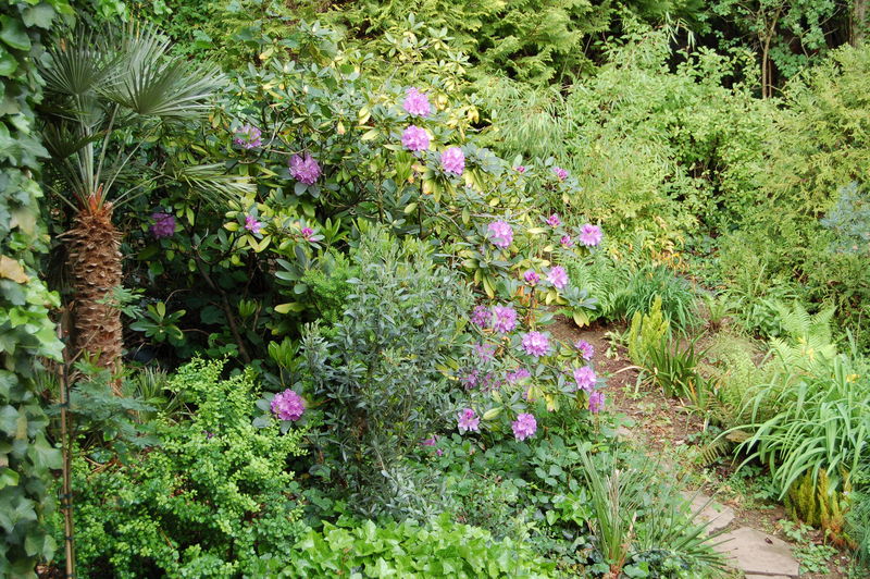 Diese Frühjahr war ich ganz mutig und habe meine 30j alte /*Chamerops humilis */ausgepflanzt,vorne i.d.Mitte Olea europaea ,ganz li Ac.dealbata