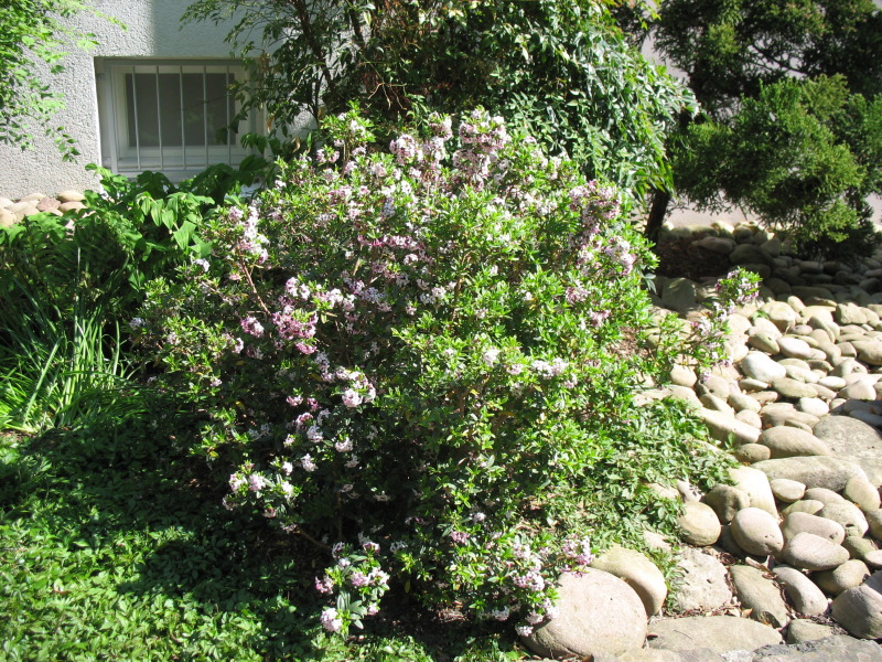 obwohl Daphne tangutica recht kompakt und langsam wächst, fordert sie sich mit der Zeit eine gewisse Fläche ein. Alte Pflanzen dehnen sich schon mal über mehrere qm aus!