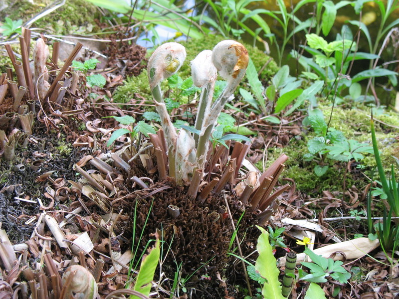 der Königsfarn, wie alle Farne im Austrieb ein Hingucker. An der Basis hat sich in den ca. 15 Jahren seit der Pflanzung eine steinharte Knolle gebildet. Aber bis die Tisch-groß wird, wie in Englischen Landschaftsgärten gesehen, ...., jedenfalls weit jenseits meines Verfallsdatums!