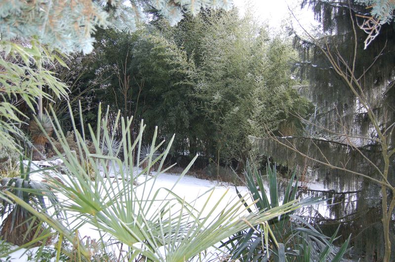 Die vom Frost etwas schmal gewordenen Blätter der Trachy vor /*Phyllostachys nigra Boryana*/ und mehreren Yucca linearifolia-"Bäumchen".Re Albizzia