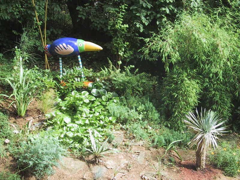 Bunter Vogel (ca 1,3m hoch) vor mittlerweile völlig zugewachsenem kl. Teich (Seerosen u.Calla palustris),li Phormium colensoi re Y.rostrata