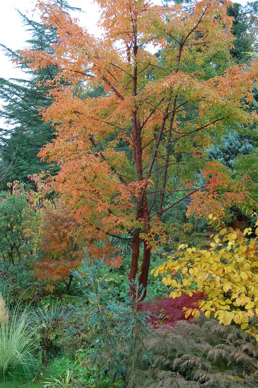 /*Acer griseum*/ mehr oder weniger orange, blaue Sequoia und gelber Hamamelis! #AM