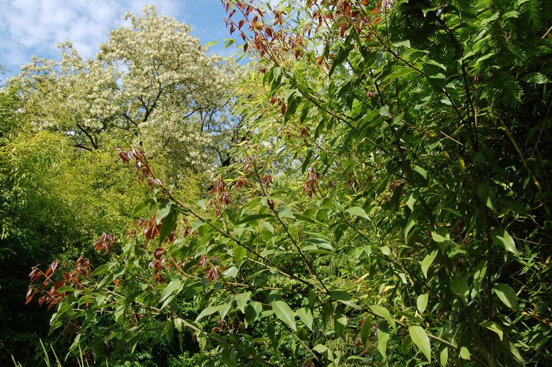 /*Quercus myrsinifolia*/ mit rötl. Blattaustrieb,einfach schön! Im Hintergrund diesmal kein Schnee, sondern eine blühende Robinie