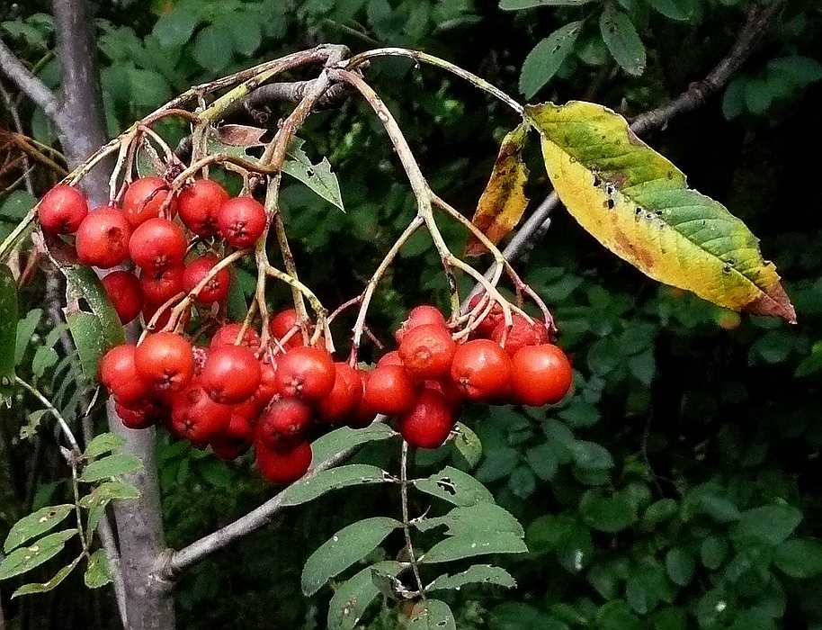 Andreas hat unten /*Sorbus aucuparia ‚Rosina’*/ ins Gespräch gebracht, eine Auslese der „Süßen Eberersche“ (S. aucuparia ‚Edulis’). Ich habe ein >2 m hohes Exemplar erst seit dem vorigen Jahr, und der Fruchtansatz ist noch dürftig mit zu kleinen Früchten (Bild). Aber diese sind (wie unten gesagt) ohne Bitterstoffe, und als aromatisches „Naschobst“ bereichern sie das Gartenglück.