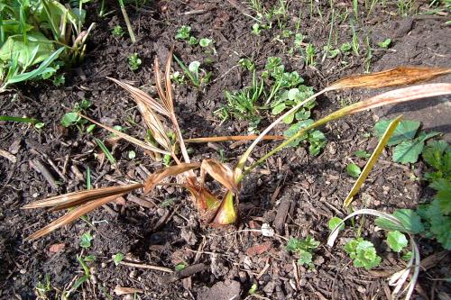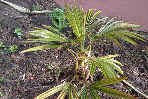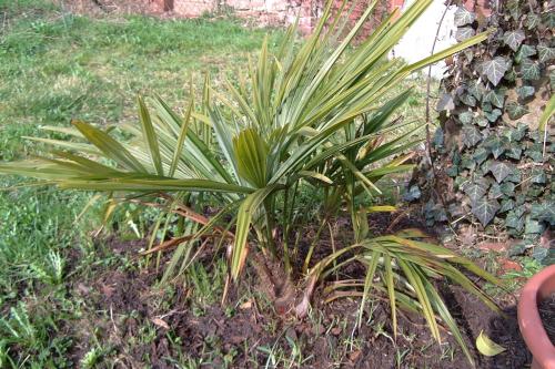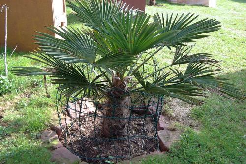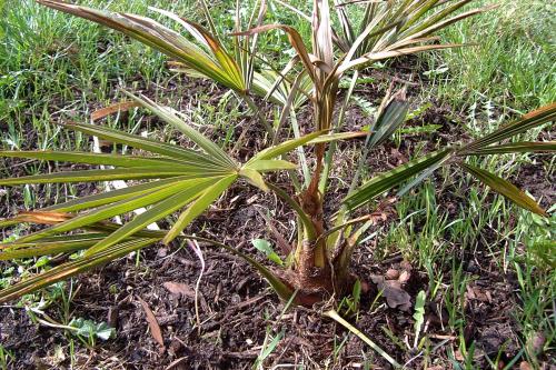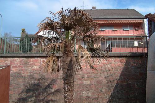 Große Trachy ausgepflanzt seit 1994 mit Blattschäden.Zum 2.Mal fast totaler Blattverlust.Sie wird sich aber wieder erholen,da keine Schäden am Neutrieb vorhanden sind.