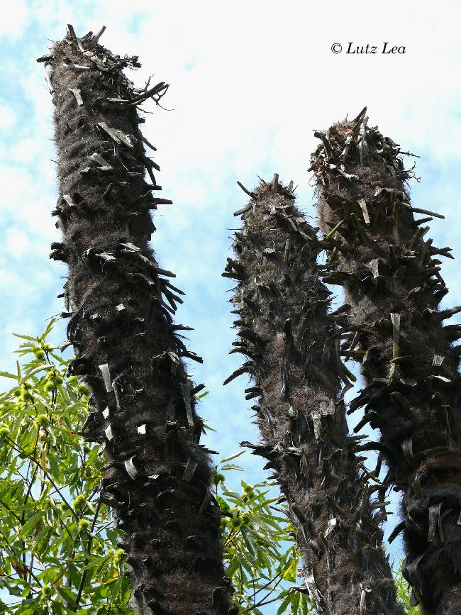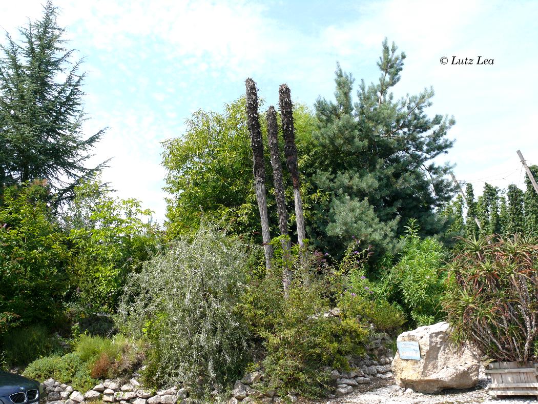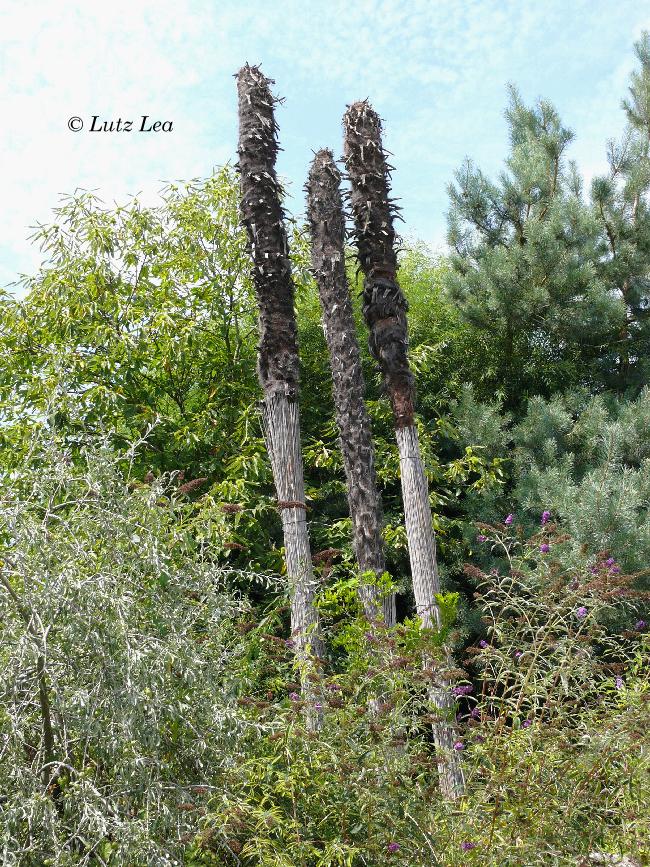 das hoffe ich mit unseren Hanfpalmen nie erleben zu müssen - sehr schade, aber war zu befürchten - die im Jahre 1996 bei der Spezialexotengärtnerei "Flora Mediterranea" vor dem Eingangsbereich auf einem Hügel ausgepflanzten, an die hundert Jahre alten und gut 8 m hohen Hanfpalmen, sind nur noch als Stämme vorhanden!