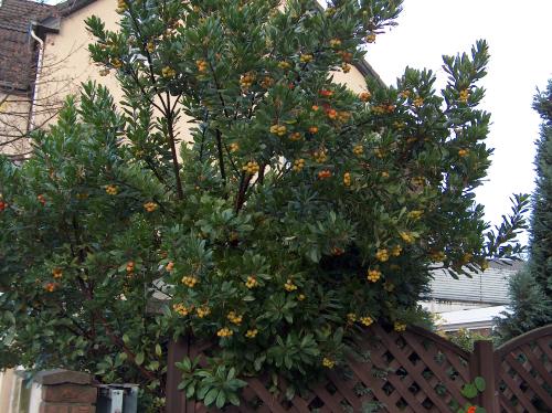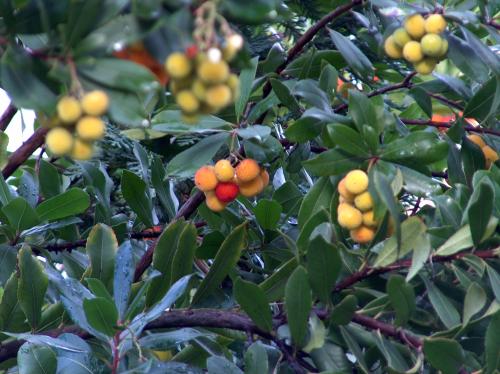 ich habe schon mal vor einiger Zeit Bilder von den Erdbeerbäumen gezeigt. Sie stehen hinter einer Mauer, aber doch recht zugig direkt an der Strasse.Sie dürften ca. 2-3 meter hoch sein. Jetzt sieht man auch genau das es sich um Arbutus handelt, es sind reichlich Früchte vorhanden.