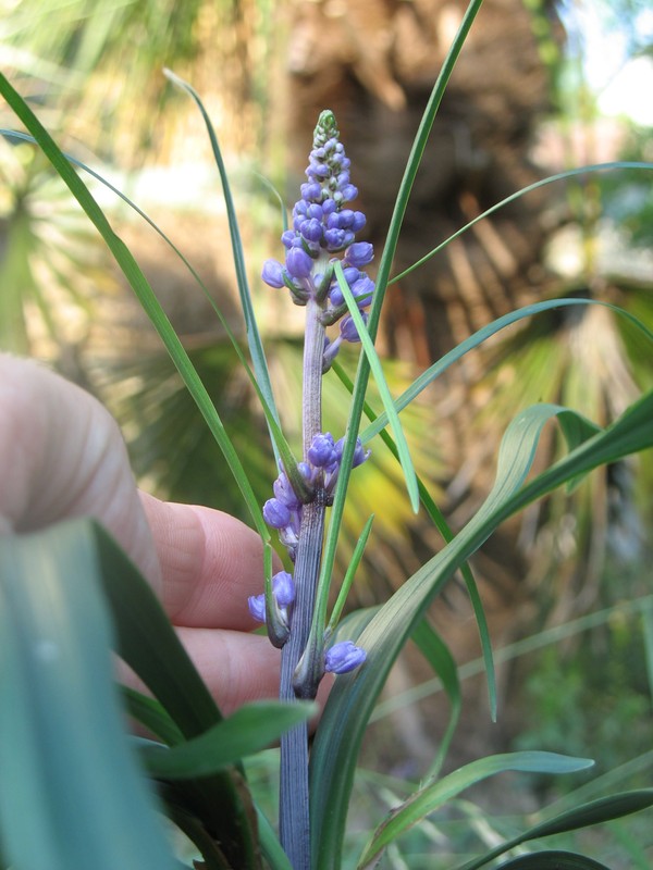 Überraschung bei einer Jungpflanze von Liriope muscari 'Royal Purple'. Ich wollte gerade das "Ungras" mit der Hand herausreißen, als mich die lederartige an Ophiopogon erinnernde Beschaffenheit einhalten lies. Das genaue Hinschauen ergab - von wegen Unkraut - einen Blütenstand aus dem dünnen lange Blätter ährenartig aus dem Blütenstand herauswuchsen. Die Pflanze wurde sofort bei mir im Garten ausgepflanzt zum Austesten ob diese ungewöhnliche Erscheinung stabil ist - und somit vermehrbar.