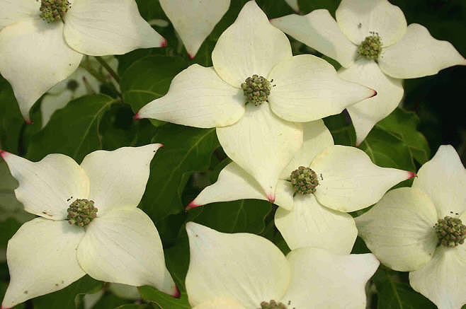 Hier /*Cornus chinensis Milky Way*/, die sich jetzt gerade zur vollen Bluetenpracht aufschwingt.