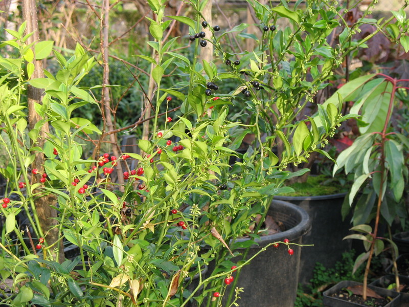 die Früchte bringens an den Tag. Beide Pflanzen wurden in Holland - allerdings zu verschiedenen Zeiten - als S. confusa erworben. Deren Beeren sind allerdings nur schwarz. Bei der Pflanze mit den roten Früchten dürfte es sich um S. ruscifolia handeln.