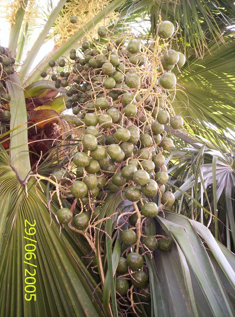 Hier die (allerdings noch grünen) Samenstände vom Vorjahr, ich hoffe die Samen sind nach etwas Nachreifezeit trotzdem keimfähig, Sabal soll ja einhäusig sein. Deren Durchmesser beträgt übrigens mindestens 3-4cm.