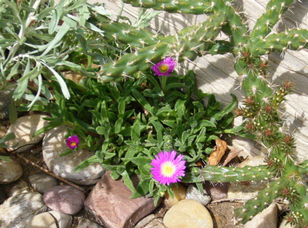 .. und hier /*Delosperma sutherlandii*/, die den Winter vollkommen unbeschadet hinter sich gebracht hat. Rechts davon Opuntia imbricata, links Artemisia tridentata...