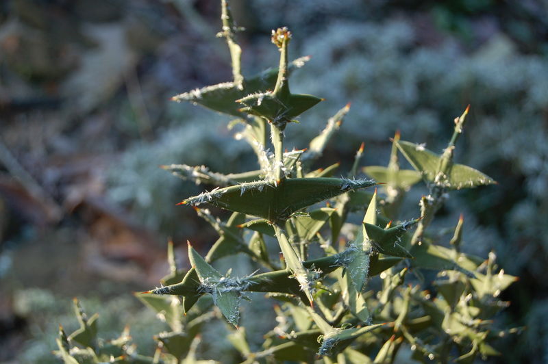 Die Eiskristalle auf /*Colletia cruciata*/ verstärken noch den martialischen Eindruck der Pflanze