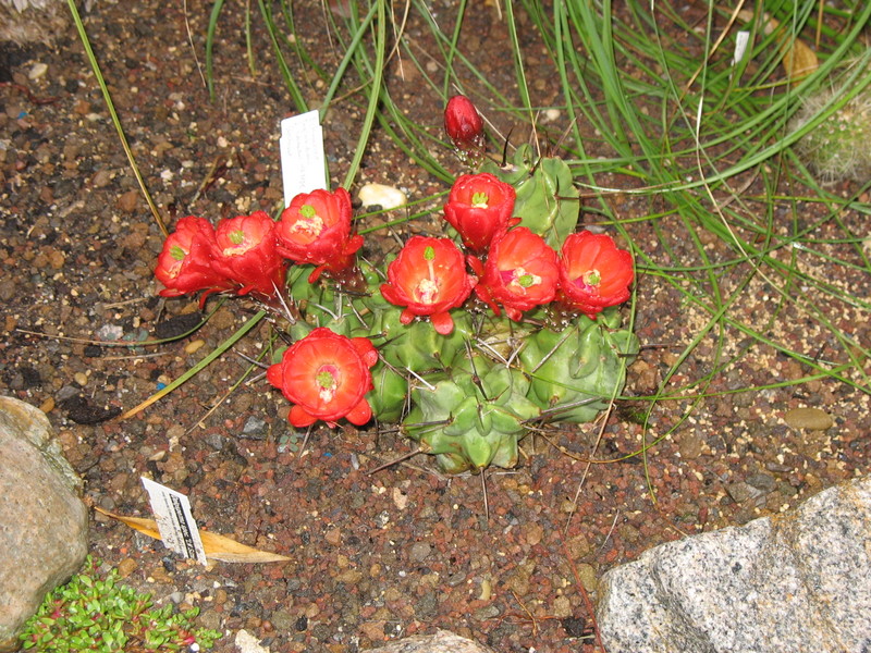 Komischerweise kann selbst das schlimmste Wetter den Blüten von /*Echinocereus triglochdiatus*/ nichts anhaben. Eine Ausnahme unter den Kakteen in meinem Xerophytenbeet. Hier eine etwas seltenere zweidornige Form.