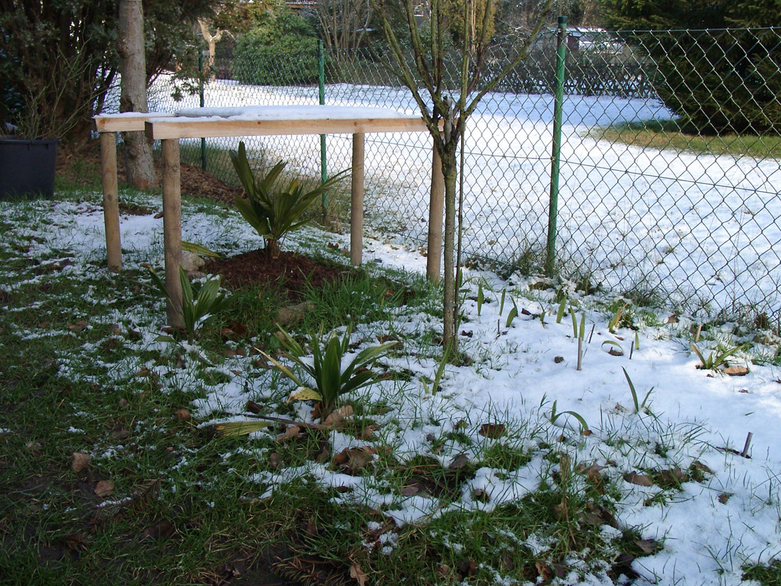 Ob er was nützt, weiß ich nicht, aber geschadet hat er nicht. Und der Aufwand ist minimal. Ich habe extra so lange Querlatten genommen, damit ich mit den Pfählen nicht in die Wurzeln komme.