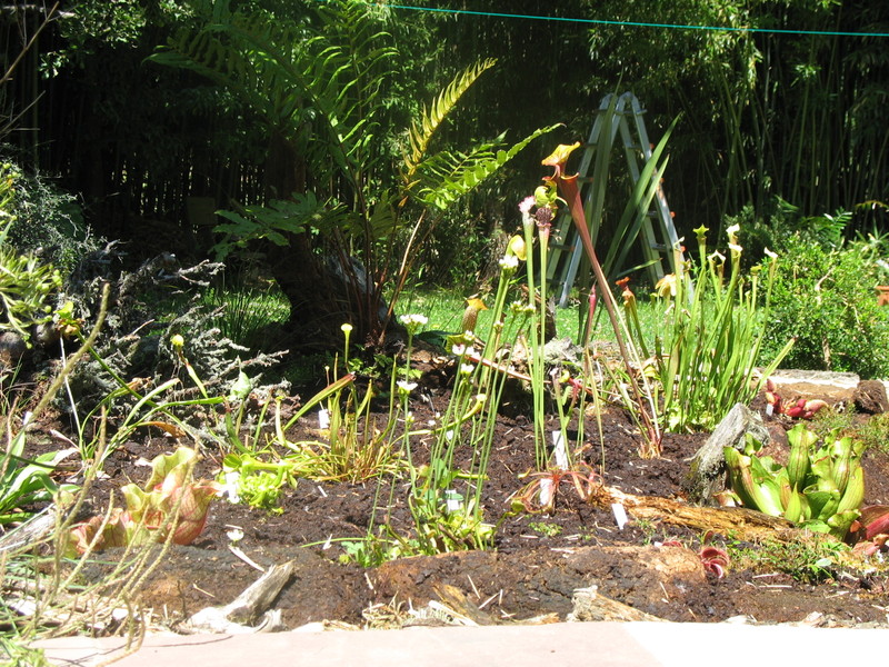 Kleine Übersicht über einen Teil des Beetes mit dem Farn Blechnum chilense im Hintergrund. War ein Tip von Christian/Südpfalz diesen großen auffälligen Farn mit ins Moor zu nehmen - und er scheint sich dort wohl zu fühlen.