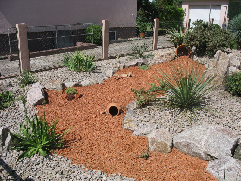 Wenn aber die Bedingungen stimmen (hier voll besonnt auf Sandboden) mach ich das durchaus auch - und vor Allem mit der passenden Bepflanzung. Bei dieser Umgestaltung vom Gemüse- zum Xerophytengarten konnten die Besitzer altershalber (beide Mitte 80) die Arbeit nicht mehr bewältigen und waren - was recht selten vorkommt - mit der Umwandlung zur "Wüste" einverstanden. Selbst Gießen entfällt! Allerdings ein Minimum an Pflege muss sein wie z.B. Unkrautentfernen das ich heute erledigte. In feuchten Zeiten gedeiht es selbst in diesem Substrat, speziell dem Standort angepaßte Arten wie div. Euphorbien und auch der unvermeidliche rote Klee, und das trotz dem Bändchengewebe welches Erde und Schotter voneinander trennt.