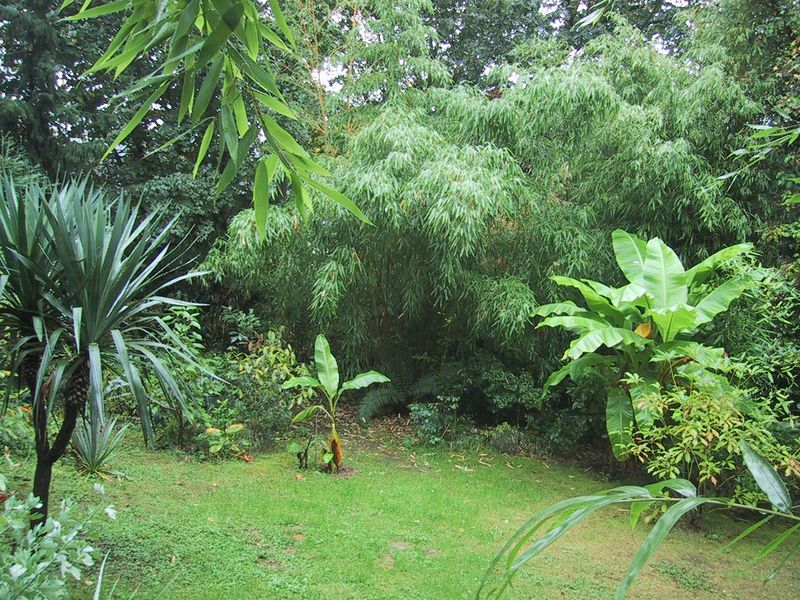 Hier fehlt ein Größenvergleich: Musa sikk. ca 1,50m hoch.M.basjoo ca 3-4m.Phyllostachys vivax aureocaulis ca 7m.Re Trochodendron aralioides