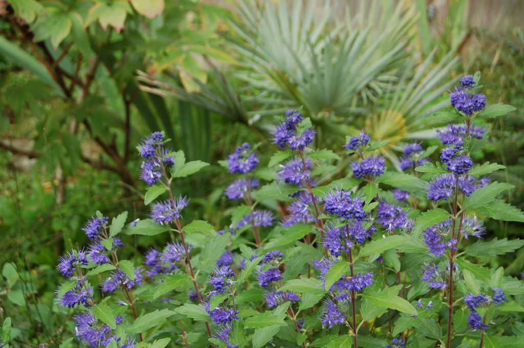 auch für den kleinen Garten:/*Caryopteris x clandonensis*/. Im Hintergrund Chamerops humilis cerifera (durch den letzten Winter gekommen !!!!!!!