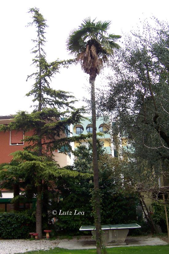 Im Jahr 1990 hatte ich mit meiner Frau in einer privaten Garni-Pension übernachtet. Der dortige Garten war sehr mediterran ungehaucht. Ferner gediehen dort unzählige Trachyjungpflanzen. Die nette Besitzerin gab mir eine Jungtrachy aus ihrem Garten mit nach Deutschland. Dieses Exemplar ist jenes, welches heute seit 1992 ausgepflanzt so toll in unserem Garten hier in Langen gedeiht. Es ist ein "Steifblatttyp" mit überdurchschnittlich fetten Stamm und guter Frosthärte. Der "Rivaner-Trachy" gedeiht aber sehr langsam und ist extrem blühfaul (jene sind ganz klein und unscheinbar). Diese Hanfpalme ist irgendwie ganz anders als alles was ich bisher an Trachies sah!