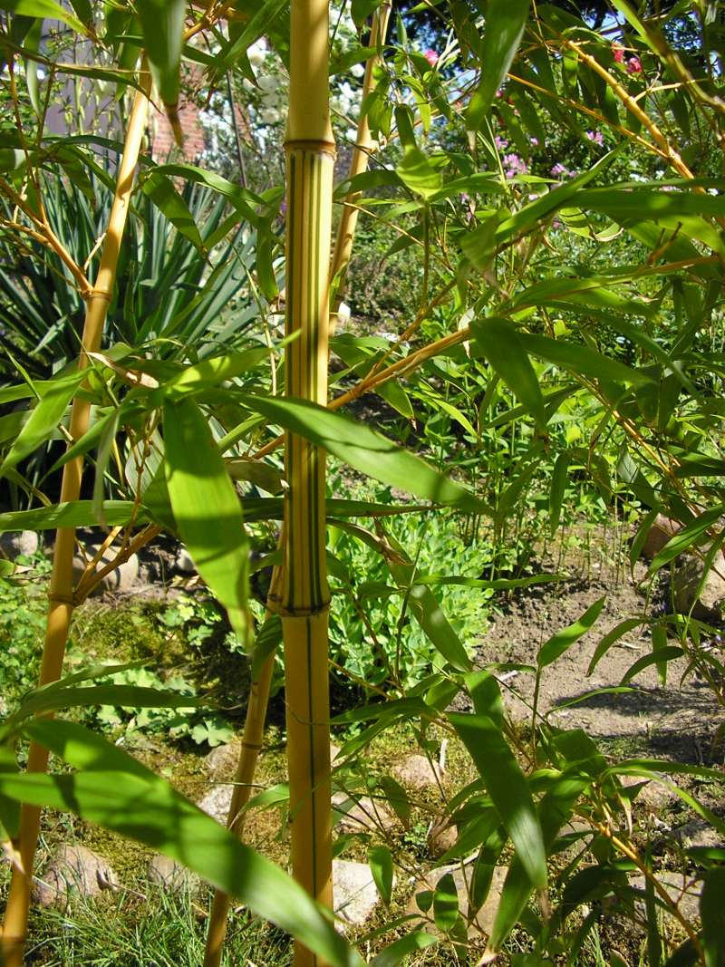 dies hier ist zwar nicht Bambusa vulgaris'striata', aber der Phyllostachys Vivax aureocaulis zeigt auch eine hübsche Halmstreifung.