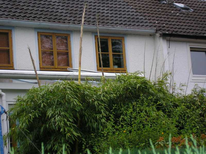 die Halmstärke dieses seit 2 Jahren gepflanzten Ablegers liegt zwar erst bei 2,5 cm, aber die Mutterpflanze im alten Garten (eingeperrt in relativ kleiner Rhizomsperre, kein Dünger etc.!!) schiebt zur Zeit gerade recht fette Halme von ca. 5 cm Durchmesser und entsprechender Höhe:
