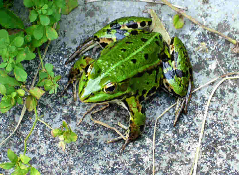 ..und hier zum Abschluss ein Teichfrosch (/*Rana esculenta*/), inzwischen ganz zutraulich und auf Futter wartend. An die Bluetenbesucher des Eupatorium cannabinum (Wasserdost, Kunigundenkraut) kommt er nicht heran.