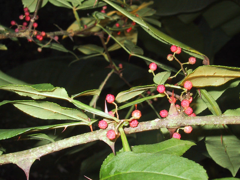 immergrüner,duftender (Blätter duften zerrieben nach Minze)Strauch aus Ostasien mit roten,kugeligen Früchten(/*Zanthoxylon alatum var.planispinum*/)