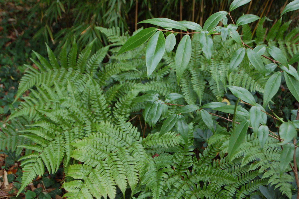 mit Fargesia rufa, Dryopteris erythrosora und vorne /*Chimonanthus nitens*/ #AM