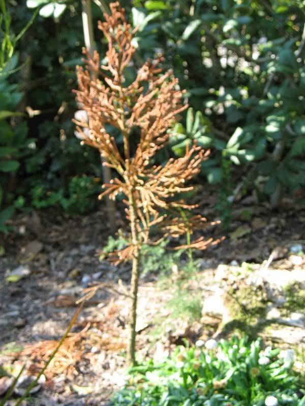 Hier deutet die Färbung leider auf "Ewigen Winter" hin - und mit Athrotaxis cupressoides ist diese Gattung nun in meinem Garten ausgestorben. A. laxifolia hatte sich bereits letztes Jahr wenige Tage vor der Pflanzung noch im Topf verabschiedet. Ursache unbekannt. Wintereinwirkung schließe ich aus. Bodenpilze??? Oder sonsige speziellen Ansprüche ?