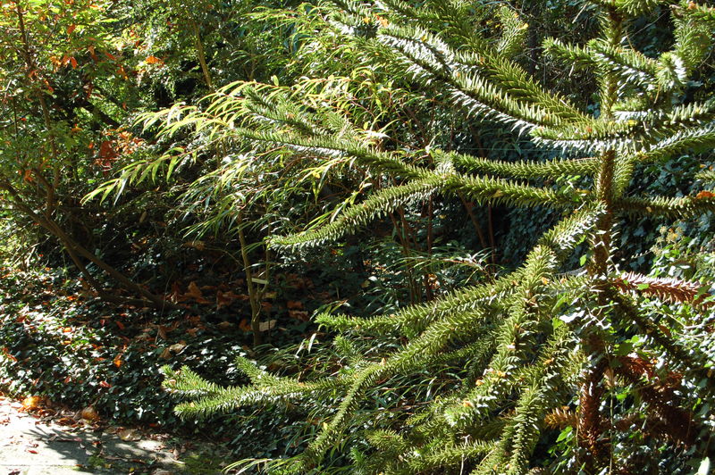 /*Araucaria araucana*/ vor Stachyurus salicifolius,( immergrün!!) und Stranvaesia davidiana