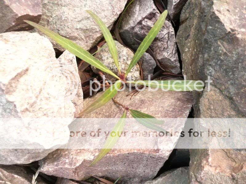 Unter Schneeschutz grün gebliebener Wurzelausläufer (nur die Allerkleinsten bleiben wintergrün).Die Granitporphyrsteine sind nur Abdeckung über dem roten Lehmboden.