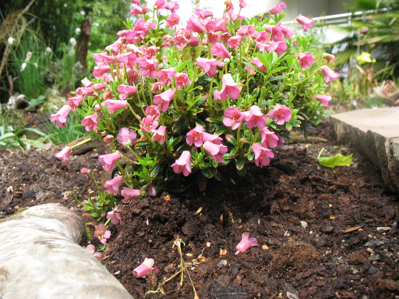 sehr ungewöhnlicher und wenig bekannter kleiner Zwerg /*Rhododendron campylogynum var. myrtilloides*/. Seit vielen Jahren wieder einmal ein Versuch mit Rhododendron. Auf dem normalen Auwaldboden unmöglich, aber im aufbereitenten Hochbeet am Rande des Moores könnte es gehen.