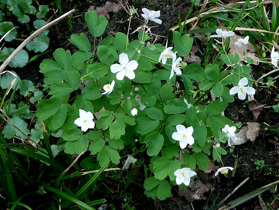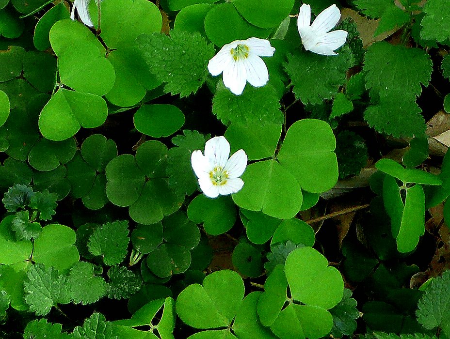 /*Oxalis acetosella*/, der Gewöhnliche Sauerklee, verträgt tiefen Schatten:
