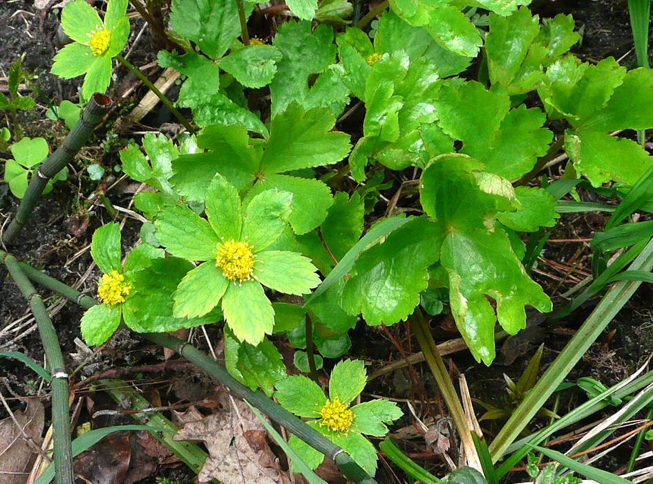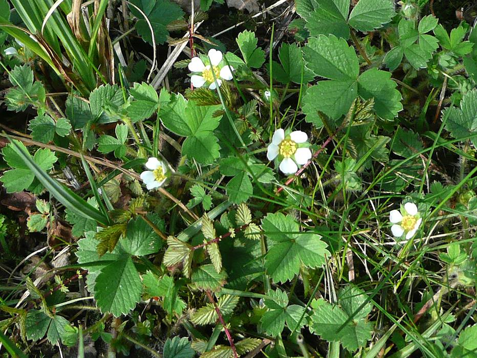 Das Erdbeer-Fingerkraut /*Potentilla sterilis*/ ähnelt sehr der Erdbeere, unterscheidet sich jedoch unter anderem durch die vorn eingebuchteten Kromblätter und die sehr viel frühere Blütezeit: