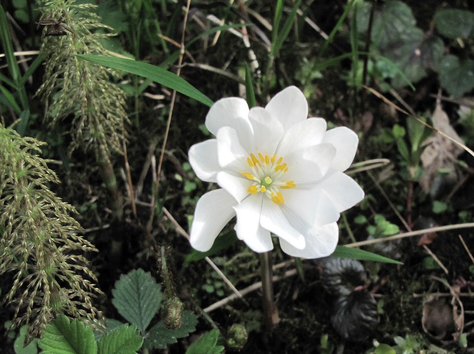 /*Sanguinaria canadensis*/ wohl in einer Zuchtform. Die normale Wildform mit etwas weniger Kromblättern ist schon längst verblüht: